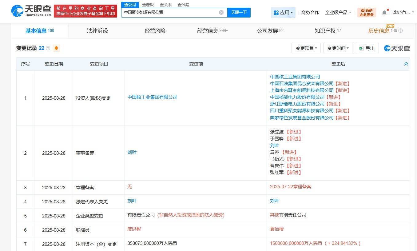 【大河财立方消息】天眼查工商信息显示,近日,中国聚变能源有限公司发生工商变更,新增中国石油集团昆仑资本有限公司、中国核电(601985)、浙能电力(600023)等为股东,注册资本由约35.31亿人民币增至150亿人民币,增幅约325%,刘叶由董事变更为董事长,同时,新增多位主要人员。